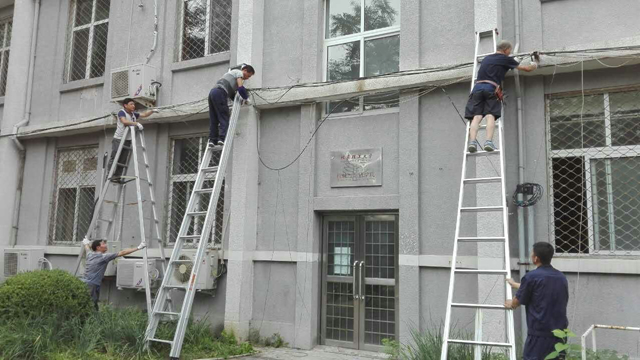 细细的电线背后,关键在于多部门的协调沟通。后勤集团选派技术过硬的员工组成清理小组,并与校保卫处、网络中心、部分学院及校外相关单位密切合作、协调配合,多次深入现场实地勘察、掌握第一手资料,为工程的顺利开展奠定坚实的基础。贯穿暑假,每天早上7点,作业人员就在相关楼宇集合,按照事先绘制的清理飞线的图纸,绞断线路,切割铁架。新学期开学前,第一阶段清理工作顺利完成,拆除各类废旧线路约1700多米,各类三角架、铁架等1100多处,几栋楼宇呈现出整洁外观。