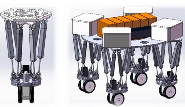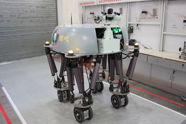 自动化学院运动驱动与控制研究团队曾在2010年参与了国家“863”计划项目——液压四足机器人协同驱动控制研究。课题组的研究生们正是通过对四足机器人的研究,在指导教师的鼓励和指导下,大胆提出了一个“颠覆”性的技术方案,即将通常使用的并联式六自由度平台“上下颠倒”,化“台”为“腿”,并在“腿上”加装轮足机构。这一填补了国内外四足机器人研究空白的方案,极具创新性,堪称“北理工首创”。