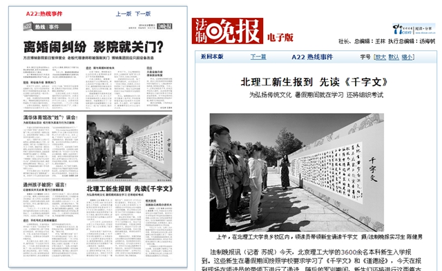 【法制晚报】北理工新生报到 先读《千字文》
