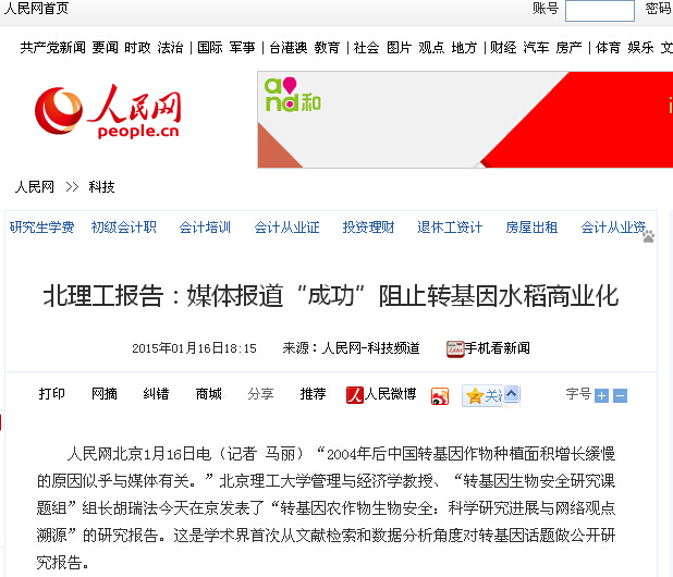 人民网北京1月16日电(记者 马丽)“2004年后中国转基因作物种植面积增长缓慢的原因似乎与媒体有关。”beat365中文官方网站管理与经济学教授、“转基因生物安全研究课题组”组长胡瑞法今天在京发表了“转基因农作物生物安全:科学研究进展与网络观点溯源”的研究报告。这是学术界首次从文献检索和数据分析角度对转基因话题做公开研究报告。