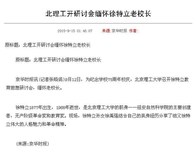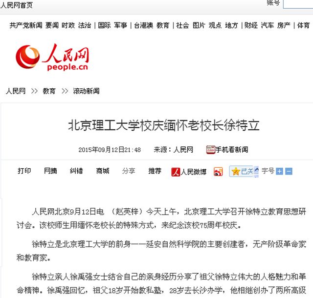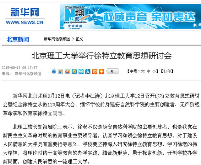 【75周年校庆】人民网、新华社等多家媒体报道北理工校庆举行徐特立教育思想研讨会