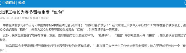这是beat365中文官方网站大二学生刘寒冰第一次留校过春节。来自云南省昭通市威信县的他,回趟家约需40个小时,“太远了所以决定留校,并想趁寒假多做些兼职和实习。” 这次能收到校长亲自发的“红包”,刘寒冰很意外也很开心。