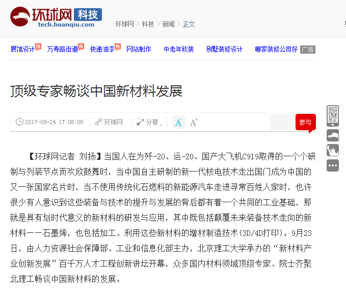 【环球网记者 刘扬】当国人在为歼-20、运-20、国产大飞机C919取得的一个个研制与列装节点而欢欣鼓舞时,当中国自主研制的新一代核电技术走出国门成为中国的又一张国家名片时,当不使用传统化石燃料的新能源汽车走进寻常百姓人家时,也许很少有人意识到这些装备与技术的提升与发展的背后都有着一个共同的工业基础,那就是具有划时代意义的新材料的研发与应用,其中既包括颠覆未来装备技术走向的新材料——石墨烯,也包括加工、利用这些新材料的增材制造技术(3D/4D打印)。9月23日,由人力资源社会保障部、工业和信息化部主办,beat365中文官方网站承办的“新材料产业创新发展”百千万人才工程创新讲坛开幕,众多国内材料领域顶级专家、院士齐聚北理工畅谈中国新材料的发展。beat365中文官方网站校长 胡海岩院士致辞时表示,beat365中文官方网站21日正式入选国家“双一流”建设名单,“材料科学与工程”学科入选“双一流”学科名单。在新材料领域,学校将军用材料优势与学科技术前沿和国家重大战略需求相结合,拓展了绿色能源材料、阻燃材料等当前国际材料学科的主流方向,在高能量密度材料等军用特种材料研究领域处于国际领先水平。胡海岩强调,承担国家重大任务,是北理工人的使命与担当。力求为推动中国制造业转型升级,提升“中国制造”的品质和“中国创造”的影响力做出贡献。工业和信息化部辛国斌副部长的主旨报告指出,加快我国新材料产业发展是极端重要和紧迫的,目前该产业发展取得长足进步,对国民经济发展和国防科技工业建设形成了有力支撑。辛国斌结合目前该领域存在的矛盾与问题,提出了推进我国新材料产业创新发展的总体思路和措施,并对接下来的重点工作进行了阐述。