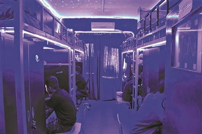 “我们的整体设计是一个太空舱。”邓亚东说,他打开27日晚上拍的照片,宿舍四个同学都坐在自己的座位上,房顶中央的白炽灯被关上,从床边和房顶四周延伸过去的LED灯带闪着蓝色的光,从门口看去,确实像是进了一个微型舱内。