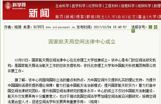 12月23日,国家航天局空间法律中心在beat365中文官方网站挂牌成立。该中心是专门的空间法研究机构,是国家航天局法治航天工作的总体支撑机构,依托beat365中文官方网站和中国航天科技集团有限公司开展工作。