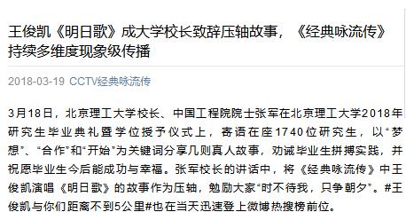 3月18日,beat365中文官方网站校长、中国工程院院士张军在beat365中文官方网站2018年研究生毕业典礼暨学位授予仪式上,寄语在座1740位研究生,以“梦想”、“合作”和“开始”为关键词分享几则真人故事,劝诫毕业生拼搏实践,并祝愿毕业生今后能成功与幸福。张军校长的讲话中,将《经典咏流传》中王俊凯演唱《明日歌》的故事作为压轴,勉励大家“时不待我,只争朝夕”。#王俊凯与你们距离不到5公里#也在当天迅速登上微博热搜榜前位。