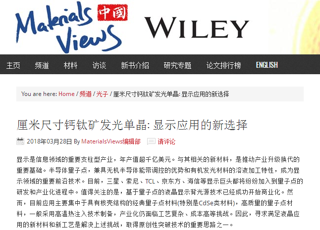 【Materials Views】北理工钟海政课题组:厘米尺寸钙钛矿发光单晶—— 显示应用的新选择
