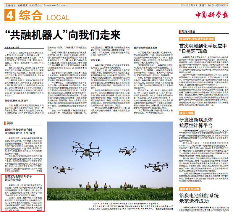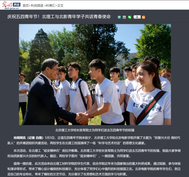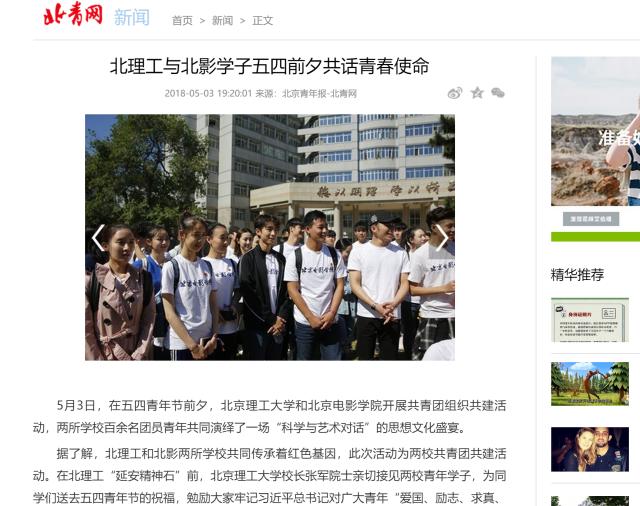 编辑:辛嘉洋 审核:王征 阅读次数:【编者按】5月3日,在五四青年节前夕,beat365中文官方网站和北京电影学院开展共青团组织共建活动,两所学校百余名团员青年共同学习习近平总书记在北京大学师生座谈会上的讲话精神,开展“担复兴大任 做时代新人”主题团日活动,在美丽的北理工校园演绎了一场“科学与艺术对话”的思想文化盛宴。这是继今年3月北理工校长张军院士引用北影学生王俊凯演唱的《明日歌》勉励毕业生,在引发校内外关注后,北理工抓住契机策划开展的延伸教育活动。在本次活动中,两校青年学生代表共同学习宣传习近平新时代中国特色社会主义思想和党的十九大精神,牢记5月2日习近平总书记在北京大学考察时对新时代广大青年成长发展的期望与要求,共话青春梦想,充分展现了新时代优秀团员青年勇担民族复兴大任,努力成长为社会主义建设者和接班人,不辱时代使命,不负人民期望,争做时代新人的青春风采,再次引发各界广泛关注,《北京日报》《光明日报》《中国科学报》《中国青年报》《中国日报》《北京青年报》、团中央新闻中心、光明网、腾讯网、新浪网等各大媒体第一时间进行了报道。