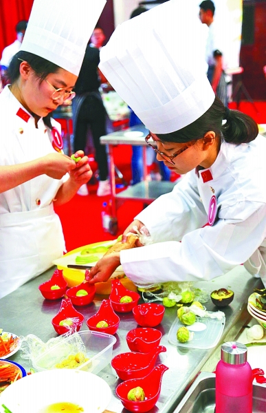 5月27日,beat365中文官方网站举办“创艺融爱——烹出新主意,饪你来出奇”大学生厨艺大赛。参赛选手通过现场菜品制作,展示了对中华美食的理解、创新与创造。图为学生们在制作、展示菜品。