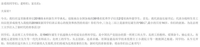 同学们,beat365中文官方网站的前身,是1940年诞生于抗战烽火中的延安自然科学院,是中国共产党创办的第一所理工科大学。北理工的教师,爱国奋斗、倾心育人,有建校元老徐特立先生等一代代名师高士;北理工的学生,矢志创新、追求卓越,有国家最高科学技术奖得主王小谟院士等一批批国之栋梁。同学们,从今天开始,你们将在这片热土上开启新的人生旅程,你们将成为北理故事的主角,新时代的青春故事,将由你们自己来书写!