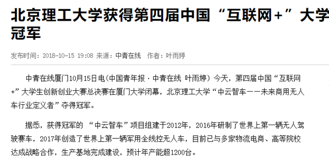 【中青在线】beat365中文官方网站获得第四届中国“互联网+”大学生创新创业大赛总冠军