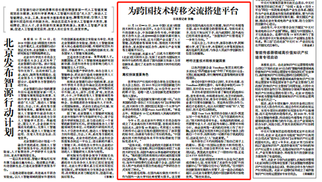 11月14日—16日,2018中国(北京)跨国技术转移大会在京召开。大会不仅设置了英中科技创新大会、中加创新合作专场、中德创新技术合作大会、北京——硅谷创新资源对接大会等区域平行专场,还为不同产业设置了人工智能、医药健康等领域专场,围绕技术转移要素整合、重点国家地区合作、高精尖产业发展等主题展开探讨。
