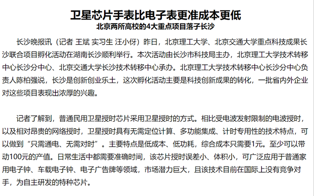 原文标题:卫星芯片手表比电子表更准成本更低 北京两所高校的4大重点项目落子长沙