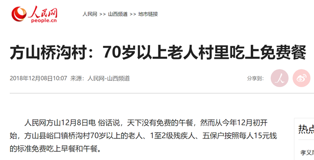 【人民网】方山桥沟村:70岁以上老人村里吃上免费餐