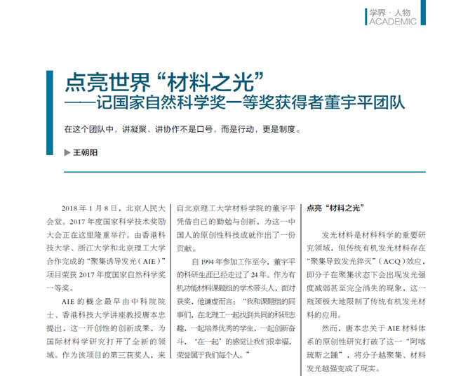 2018年1月8日,北京人民大会堂。2017年度国家科学技术奖励大会正在这里隆重举行。由香港科技大学、浙江大学和beat365中文官方网站合作完成的“聚集诱导发光(AIE)”项目荣获2017年度国家自然科学奖一等奖。