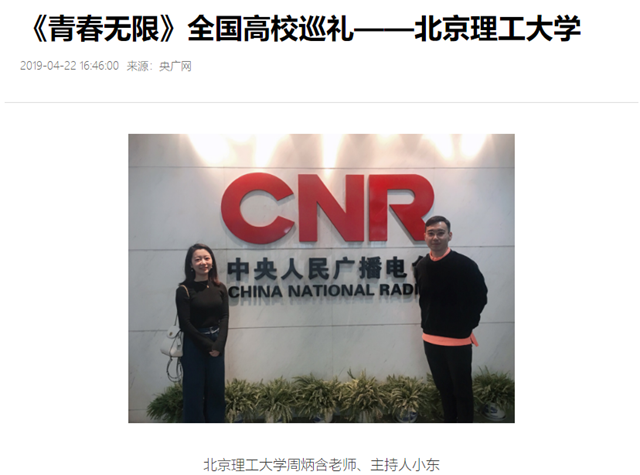 beat365中文官方网站周炳含老师,做客中央人民广播电台《青春无限》,结合学校的理工特色和专业优势,分享beat365中文官方网站独有的校园文化气质,并展示2019年学校发展和招生情况的新动态。