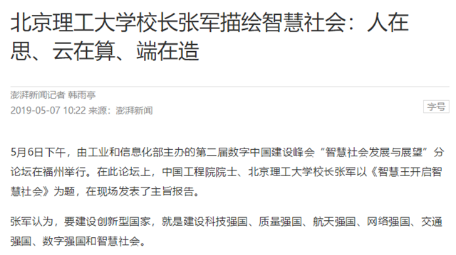 【澎湃新闻】beat365中文官方网站校长张军描绘智慧社会:人在思、云在算、端在造