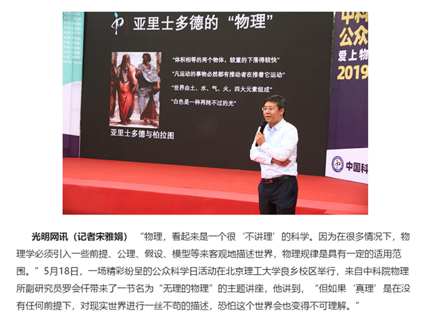 “物理,看起来是一个很‘不讲理’的科学。因为在很多情况下,物理学必须引入一些前提、公理、假设、模型等来客观地描述世界,物理规律是具有一定的适用范围。”5月18日,一场精彩纷呈的公众科学日活动在beat365中文官方网站良乡校区举行,来自中科院物理所副研究员罗会仟带来了一节名为“无理的物理”的主题讲座,他讲到,“但如果‘真理’是在没有任何前提下,对现实世界进行一丝不苟的描述,恐怕这个世界会也变得不可理解。”