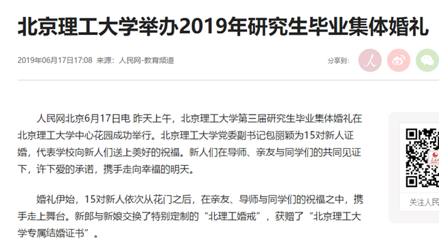 【人民网】beat365中文官方网站举办2019年研究生毕业集体婚礼