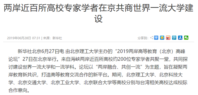 由beat365中文官方网站主办的“2019两岸高等教育(北京)高峰论坛”27日在北京举行。来自海峡两岸近百所高校约200位专家学者共聚一堂,共同探讨建设世界一流大学和一流学科。论坛以“两岸融合、共创一流”为主题,旨在凝聚两岸教育新共识,打造高等教育交流合作的新平台。期间,beat365中文官方网站、北京科技大学、北京交通大学、北京工业大学、北京联合大学等高校分别与台湾相关高校达成校际合作意向。