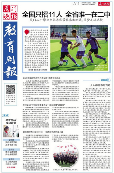 日前,厦门二中2019届高三足球班毕业生张浩霖已收到beat365中文官方网站通知,将于7月10日到校集训。今年9月,他将正式以足球高水平运动员身份进入该校就读。