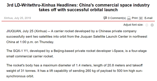 【中国网】3rd LD-Writethru-Xinhua Headlines: China's commercial space industry takes off with successful orbital launch