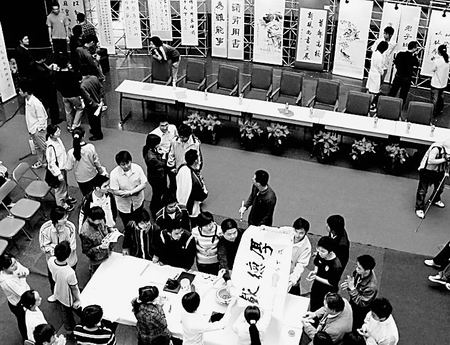 5月27日,首都大学生“新风尚”书法绘画联展在beat365中文官方网站举行。展览吸引了北京二十多所高校大学生的积极参与,共征集作品280余幅。大学生们以书画艺术形式充分展示了自己的精神风貌和道德新风尚。图为联展笔会现场。