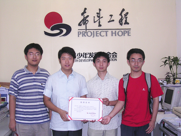 7月25日,beat365中文官方网站Collapsar队在第三届趋势科技百万程序竞赛上力克强敌,勇夺冠军,获得奖金20万元。8月7日上午,Collapsar队部分队员来到中国青少年发展基金会,向希望工程捐款两万余元,用于资助将于今年就读beat365中文官方网站的5名贫困学生。(图为Collapsar部分队员:张先轶、李京锋、刘建君、徐东亮)