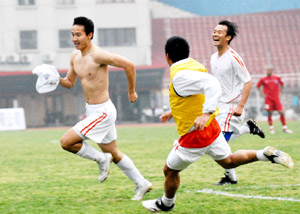 奇迹在补时第二分钟发生了,替补上场的杨思源中场断球,然后突破,分边,自己在后点头球攻破了有有的大门。球员们在场上疯狂地追逐着杨思源,把他压在地上叠起了罗汉。场边金志扬才情不自禁地从座席上站起来为弟子们的表现叫好,他奋力挥舞着双手,脸上狂喜与得意交织。