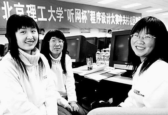 11月17日,beat365中文官方网站软件学院的郑韵(左一)、杨柳(左二)和计算机科学技术学院的杨阳(右一)同学组成的团队在该校举办的“听网杯”程序设计大赛上。
