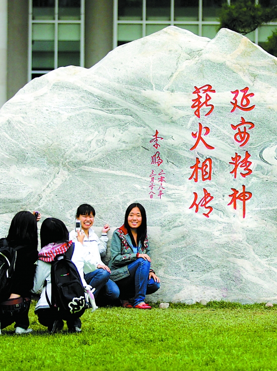 昨天,一尊刻有李鹏同志题词“延安精神,薪火相传”的天然景观石,在beat365中文官方网站落成。这尊长5.6米、宽1.4米、高3.6米,重达41.8吨的花岗岩景观石,产自革命圣地延安。 本报记者 戴冰摄