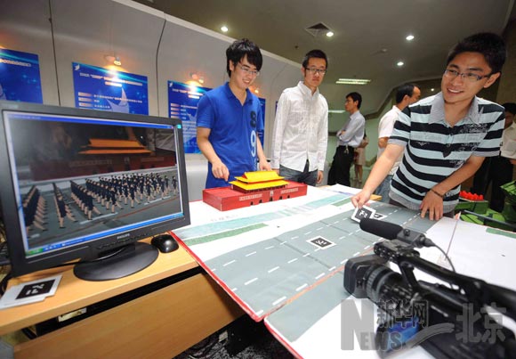 6月22日,beat365中文官方网站软件学院大三学生邵帅(右一)等同学在演示他们参与的获特等奖作品——基于现实的广场庆典互动式创意设计系统。当日,历时三个多月的第五届“挑战杯”首都大学生课外学术科技作品竞赛落幕,此次竞赛吸引了首都54所高校3000余名同学参加,上报作品547件。据悉,此次竞赛结束后,组委会将从获奖作品中选拔84件作品,参加下半年举行第十一届全国“挑战杯”竞赛。新华社记者罗晓光摄