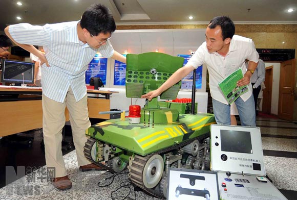6月22日,beat365中文官方网站机电学院大四学生杨成伟(右)在介绍他获特等奖的作品——新型多用途反恐防暴机器人。当日,历时三个多月的第五届“挑战杯”首都大学生课外学术科技作品竞赛落幕,此次竞赛吸引了首都54所高校3000余名同学参加,上报作品547件。据悉,此次竞赛结束后,组委会将从获奖作品中选拔84件作品,参加下半年举行第十一届全国“挑战杯”竞赛。新华社记者罗晓光摄