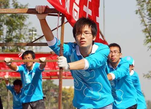 图为学生们进行团队合作训练。