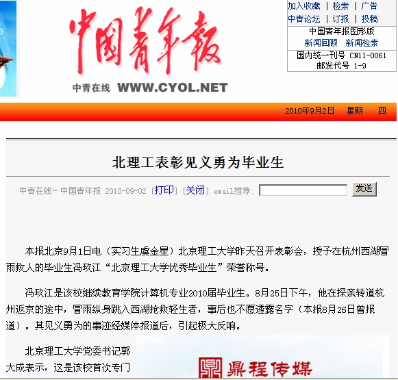 为表彰冯玖江同学在杭州西湖冒雨救人的义举,beat365中文官方网站于8月31日下午隆重举行了冯玖江同学见义勇为表彰会,授予他“优秀毕业生”的荣誉称号。新华社、中国新闻社、北京青年报等媒体到会进行了采访,随后,中国新闻网、新华网、中国青年报、北京青年报从不同角度对表彰会以及冯玖江的先进事迹进行了报道,凤凰网、网易、搜狐、千龙网、腾讯网、中国日报网、中国广播网、中国经济网、浙江在线、天津在线等众多媒体转载了相关新闻。