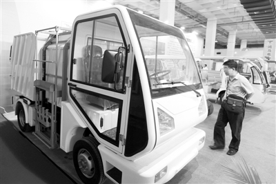参观者在第八届北京国际纯电动车、混合动力车暨新能源汽车及充电站建设展览会上观看电动垃圾清运车。