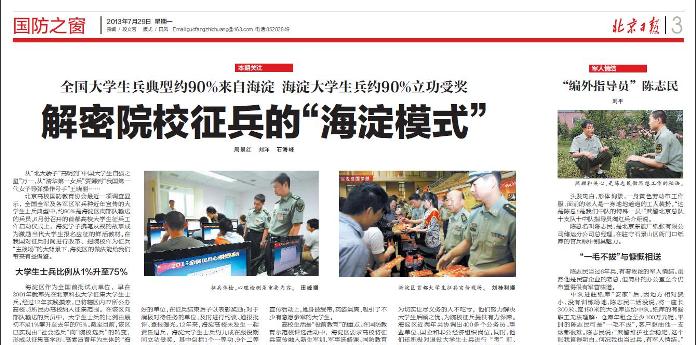 海淀区作为全国首批试点单位,早在2001年就率先在北京科技大学征集大学生士兵。经过12年实践摸索,已将辖区内27所公办高校、3所民办高校纳入征集范围。在该区向部队输送的兵员中,大学生士兵的比例由最初不足1%攀升至去年的75%。截至目前,该区已实现由“社会选兵”向“院校选兵”的转变,形成以征集高学历、高素质青年为主体的“海淀模式”,并多次被评为全国和北京市的征兵工作先进单位。