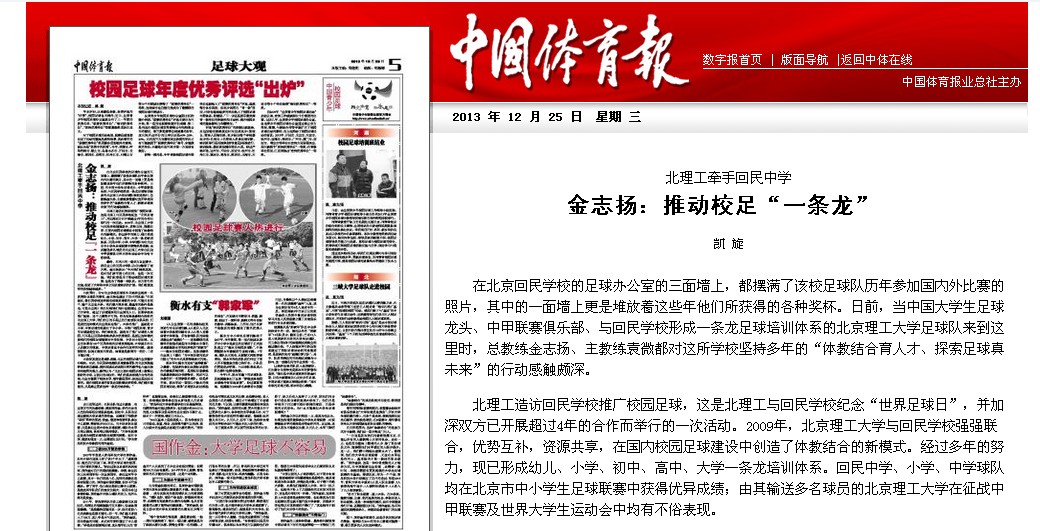 北理工造访回民学校推广校园足球,这是北理工与回民学校纪念“世界足球日”,并加深双方已开展超过4年的合作而举行的一次活动。2009年,beat365中文官方网站与回民学校强强联合,优势互补,资源共享,在国内校园足球建设中创造了体教结合的新模式。经过多年的努力,现已形成幼儿、小学、初中、高中、大学一条龙培训体系。回民中学、小学、中学球队均在北京市中小学生足球联赛中获得优异成绩;由其输送多名球员的beat365中文官方网站在征战中甲联赛及世界大学生运动会中均有不俗表现。