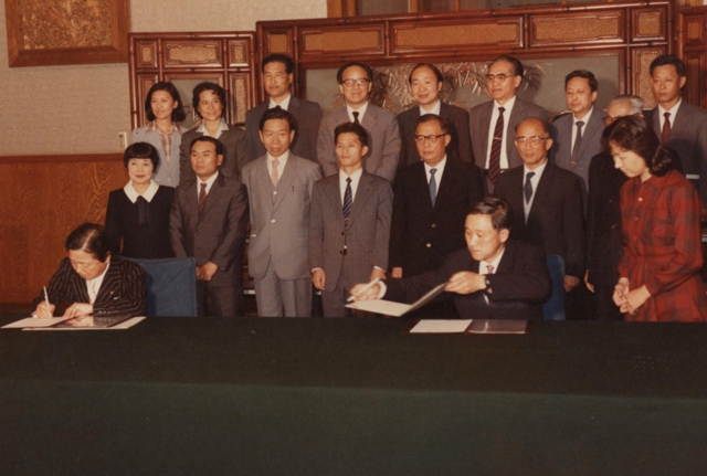(1986年在人民大会堂,朱鹤孙校长与日方签署中国工程技术人员赴日研修协议)