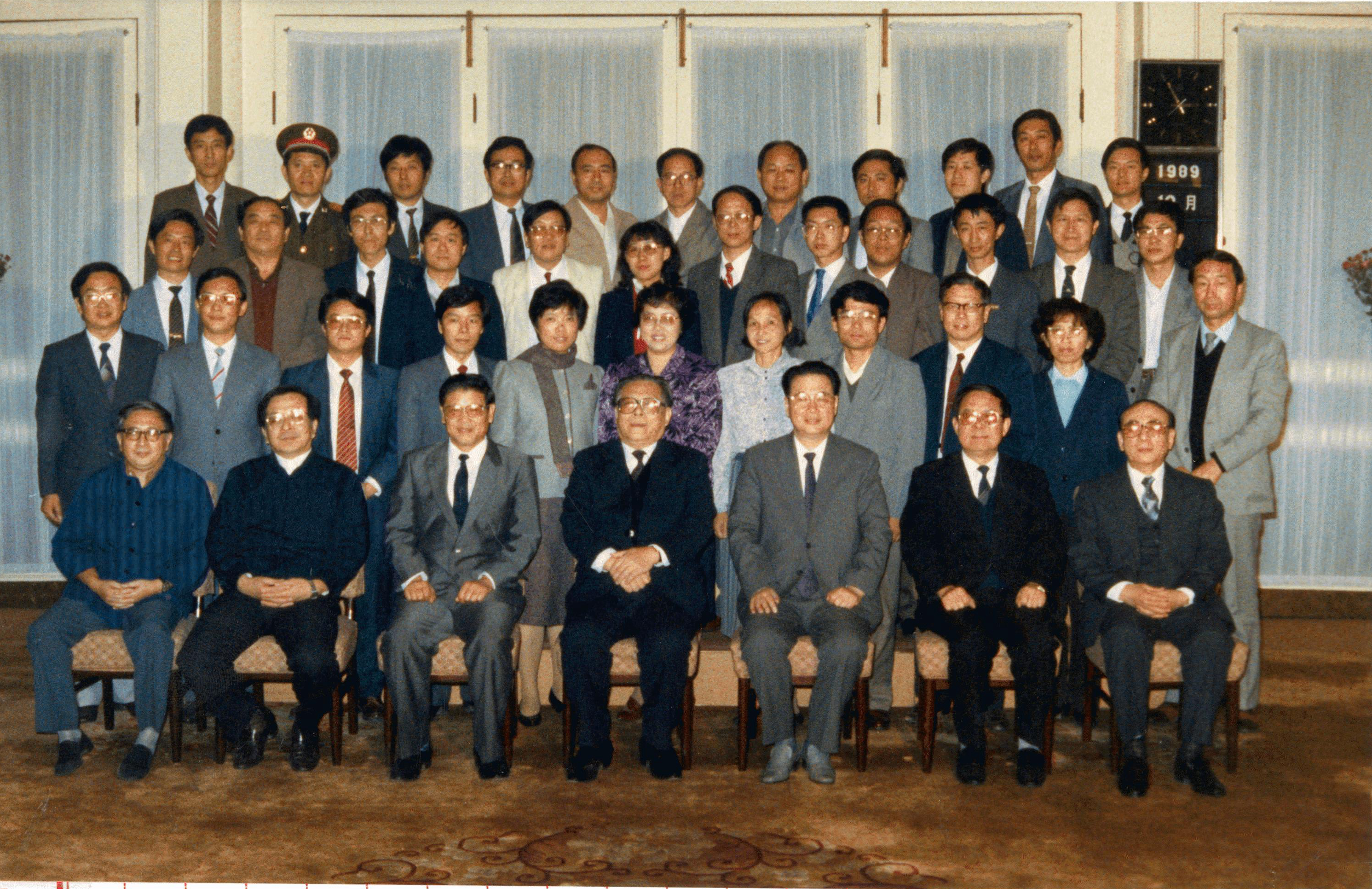 1989年10月,赵东宛校友(前排右一)陪同江泽民总书记、李鹏总理接见知识分子工作座谈会代表, 时任国家人事部部长 。