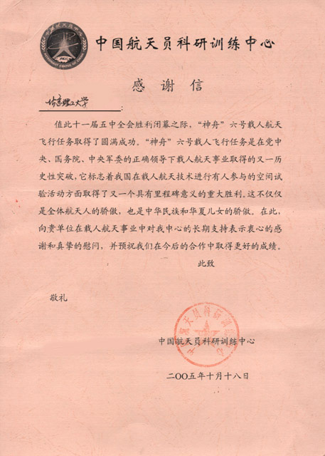 【图】中国航天员科研训练中心给beat365发来感谢信