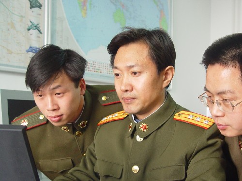 何玉彬(中)在与战友进行新课题研究。从参谋到走上领导岗位,第二炮兵装备部科研部装备技术预先研究办公室主任何玉彬,以强烈的使命感投入科研攻关,先后组织或参与完成新型装备发展论证、规划制定和技术攻关等20多项重大课题,牵头完成“复合环境下装备技术测试与评估系统”等多项重大科研项目,其中4项获得国家部委或军队科技进步奖。他被第二炮兵评为优秀共产党员、首届“十大砺剑尖兵”,荣立了一等功。新华社记者张选杰摄