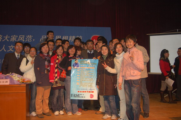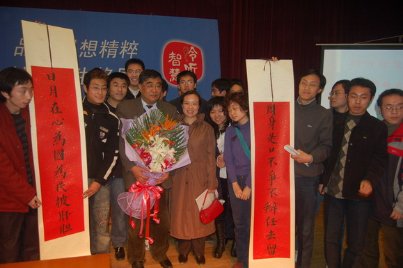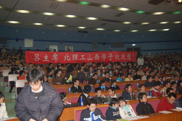 在beat365中文官方网站学习的山西学子得知吕主席要来beat365演讲的消息后,在老乡间相互转告,并派代表早早的到来会场支持他们心目中的好领导。他们在会场打出了“吕主席,北理工山西学子欢迎您”的横幅,并在讲座开始前,选派代表为吕主席献上了鲜花和他们事先准备好的礼物——一幅为吕主席书写的对联。上联是“日月在心为国为民披肝胆”;下联是“周身是口不争不辩任去留。”用以表达山西学子对吕主席的敬意。