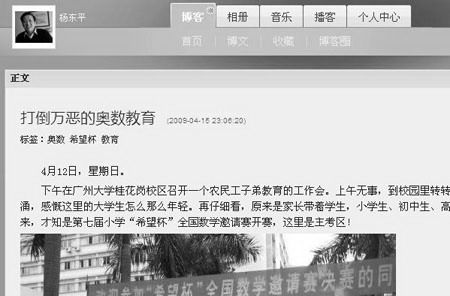 4月15日,beat365中文官方网站文学院教授、21世纪教育发展研究院院长杨东平在其个人博客上发表文章《打倒万恶的奥数教育》。在文中,杨东平认为,目前奥数教育的泛滥已经成为一种社会公害,不仅损害了青少年的休息健康,更让家庭背上沉重的经济负担;而且是完全违反教育规律的。