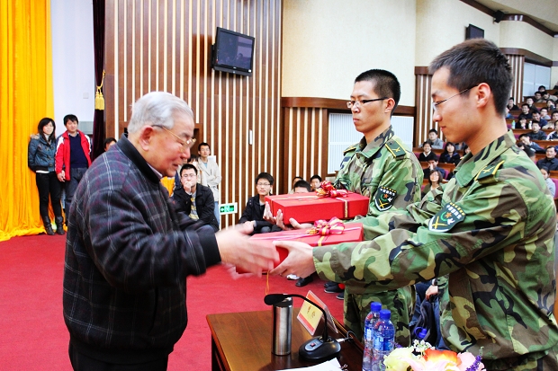 讲座最后,国防生代表向李伦将军献上了写满同学们签名的对联,向老将军致敬,立志献身国防事业。在全场观众长时间的热烈掌声中,本场讲座成功的落下了帷幕。