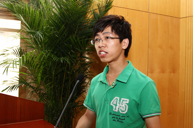 学生代表余金磊(左下)讲道:“冯玖江的英雄壮举经全国各个媒体报道,引起了很大的反响,我打心眼里为他骄傲,我为有这么一位同窗好友而骄傲。冯玖江是一个很热心的人,经常在班里帮助同学,在继续教育学院组织的各种活动中,冯玖江都积极参加,从不惜力,热情周到为同学们服务。冯玖江还是一个非常乐观的人,不管遇到什么困难,什么挫折,都会带着笑容迎难而上,我相信凭着这种乐观向上的人品和学习的劲头,他的人生道路定会越走越宽、越走越好!”