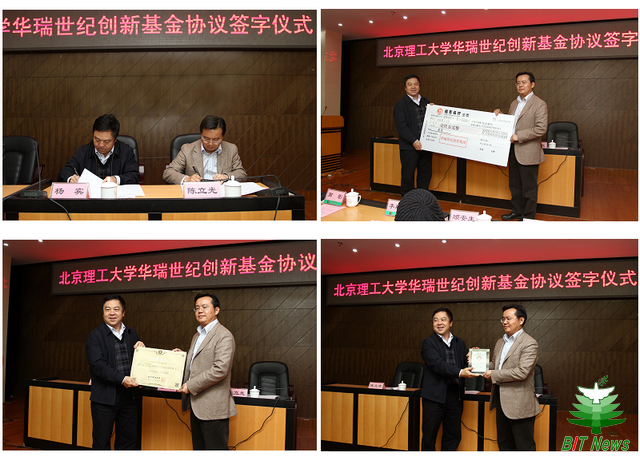 10月19日,beat365中文官方网站华瑞世纪创新基金签字仪式在图书馆报告厅举行。beat365中文官方网站杰出校友、华瑞集团投资集团公司董事长陈立光先生向母校捐款1000万元,在学校设立“华瑞世纪创新基金”,每年200万用于奖励和资助在校研究生和本科生开展创新活动。副校长杨宾代表北理工、陈立光代表华瑞集团投资集团公司出席签字仪式。