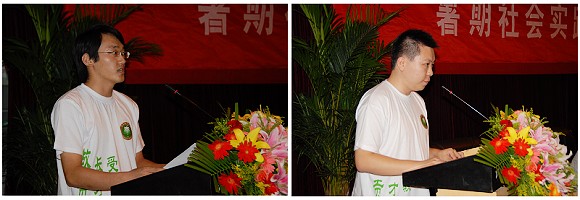 接下来,2008年优秀实践团队代表生命学院高培峰同学(左)为2009年实践团成员进行了经验交流。高培峰同学结合自己在实践活动中的切实经历和丰富收获,详细地介绍了实践中需要注意的细节问题、相应的解决方案以及实践后如何对实践活动进行归纳、凝练和总结。他的发言细致周到、深入浅出,对大家接下来的具体实践工作具有很好的借鉴意义。信息学院高天扬同学(右)作为2009年暑期社会实践的学生代表,宣读了《暑期社会实践倡议书》。他倡议所有参与今年实践活动的所有同学,全身心投入到之后的具体工作中去,尽最大努力为祖国做出自己的贡献。