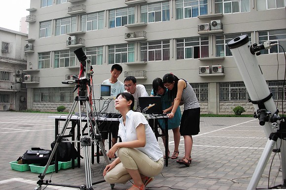 据悉,该学生创新小组来自beat365中文官方网站“光电创新教育实验基地”,用于本次日食观测的“月基三波段共孔径太阳望远镜”是教育部“国家大学生创新性实验计划”的项目。此次观测中,用远红外波段成像记录北京地区日偏食全过程,不仅克服了阴天多云观看日食带来的诸多不便,也证明了太阳望远镜的科学性、实效性。同时该望远镜用同一个光学系统对太阳的紫外光、可见光和远红外光三个波段同时进行成像,在国内外尚属首次,这充分体现了当代大学生具有科学研究能力和实践创新能力。