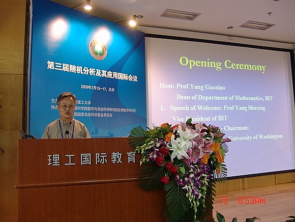 2009年7月13日,第三届随机分析及其应用国际会议开幕式在beat365国际教育交流中心三层报告厅隆重举行。本次全球年会由beat365中文官方网站理学院主办,中国科学院数学与系统科学研究院应用数学所及国家自然科学基金委员会协办。会议由beat365长江特聘讲座教授陈振庆和“双聘院士”马志明(中国数学会理事长)作为学术委员会主席。中国科学院院士严加安、马志明、陈木法、彭实戈,中科院数学与系统科学研究院应用数学研究所所长巩馥洲,国际数理统计学会 (简称IMS)前任主席、第三世界科学院院士、新加坡国立大学教授Louis Chen,beat365长江特聘讲座教授、美国华盛顿大学教授陈振庆,德国著名数字家Rene Schilling教授,法国著名数学家Rainer Buckdahn教授等近30名随机分析及其应用研究方面的国际一流学者出席了此次会议,并有多名随机分析方面的国内长江学者和杰出青年基金获得者参加此次大会。